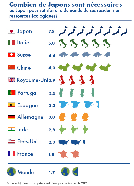 La date du 29 juillet 2021, calculée par le Global Footprint Network, correspond au jour où l’humanité aura utilisé autant de ressources biologiques que ce que la Terre peut régénérer en une année. Autrement dit : à partir de cette date, nous vivrons 5 mois dans le rouge en entamant le capital naturel qui pourrait nous faire vivre convenablement les années suivantes. Actuellement, nous utilisons 74 % de plus que ce que les écosystèmes de la planète peuvent régénérer, soit l’équivalent des ressources que produirait “1,7 Terre” en une année.