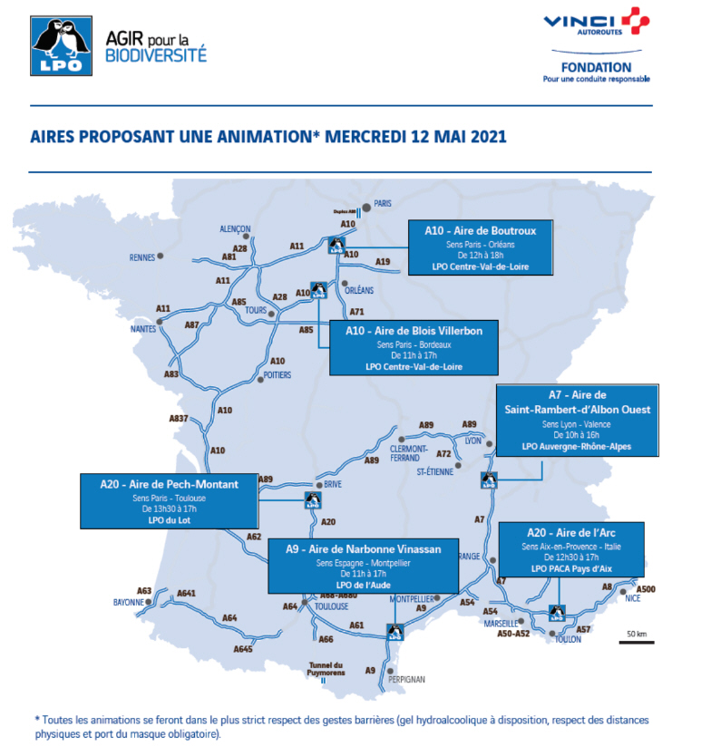 Liste des aires proposant une animation1 LPO-Fondation VINCI Autoroutes mercredi 12 mai 2021 :