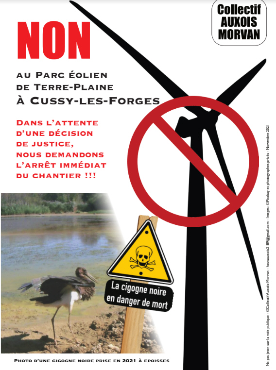 Cussy-les-Forges est un site d’élevage important, difficilement conciliable avec l’éolien (problème de lactation des bêtes, de reproduction...). C’est également un site fort en biodiversité où cigognes noires et blanches y passent et nidifient. Le parc éolien de Terre-Plaine est un projet industriel privé, avec une rémunération garantie par l’Etat pendant 20 ans. Cette promesse de l’Etat est directement financée par nos factures d’électricité ! Contesté par plusieurs associations de défense de l’environnement, le projet est actuellement en attente de décision de justice, près de la Cour d’Appel administrative de Lyon. Cette décision fixera le sort du projet : autorisation d’exploiter ou non. La décision ne doit intervenir que DEBUT 2022. Or, malgré une forte incertitude, l’industriel installe dès maintenant ses machines.Le chantier est en cours. Quelle vision de l’éthique des affaires ! Que se passera-t-il si la décision aboutit à un refus ?